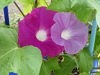 <学校の生き物たち紹介> 1年生が、毎日水やりをしているアサガオが、色とりどりの花を咲かせ始めました。