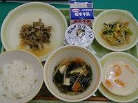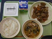 <今日の給食> ご飯・牛乳・栃木市産小麦入り納豆(たれ・辛子)・鶏肉とごぼうの炒め煮・キャベツとニラの味噌汁。