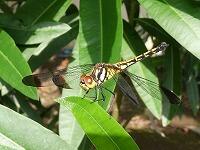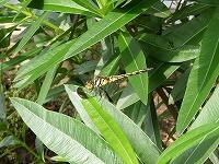 <学校の生き物たち紹介> 体育館北側の観察園のキョウチクトウの葉で羽を休めているノシメトンボ。