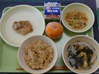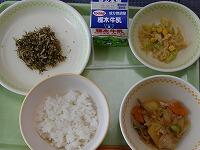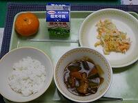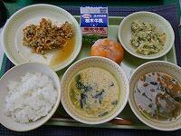 <今日の給食> コーン茶飯・牛乳・鶏肉のスタミナ焼き・切り干し大根のごま酢和え・豆腐とわかめの味噌汁・冷凍みかん