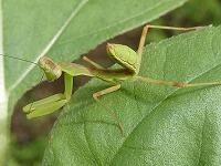 <学校の生き物たち紹介> ヒマワリの葉の上で、警戒ポーズをとるハラビロカマキリの幼虫。