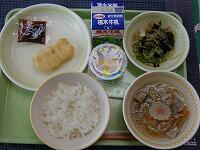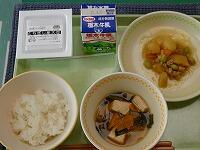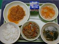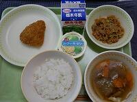 <今日の給食> ご飯・牛乳・栃木市産大豆の麦納豆(たれ・からし)・じゃがいものそぼろ煮・厚揚げの味噌汁