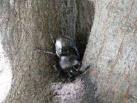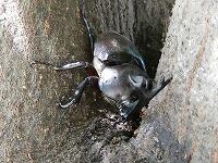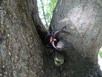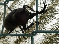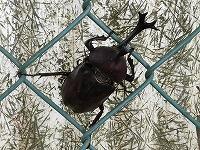 <学校の生き物たち紹介> 昨日は、西門脇のフェンスに、今朝は、シラカシの幹で樹液を吸っていたカブトムシ。