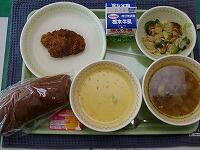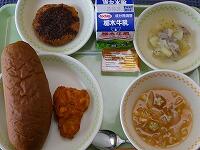 <今日の給食> 黒コッペパン・はちみつ&マーガリン・牛乳・タンドリーチキン・ジャーマンポテト・トマトとあさりのスープ