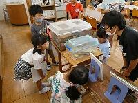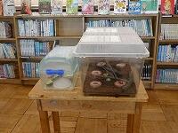 早速、本を借りに来た子どもたちが、ノコギリクワガタや、直径4㎝くらいの大きなミスジマイマイに見入っていました。