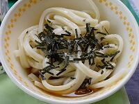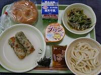 <今日の給食> 米粉パン・牛乳・冷やしうどん・めんつゆ・刻みのり・ちくわの磯辺揚げ・梅和え・豆乳プリン