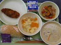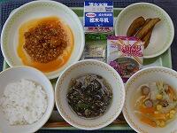 <今日の給食> ご飯・牛乳・家常(ジャーチャン)豆腐・やみつききゅうり・卵とわかめのスープ・白桃のジュレ