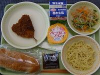 <今日の給食> ご飯(カレーライス)・牛乳・夏野菜カレー・キャベツのメンチカツ・マスカットジュレポンチ