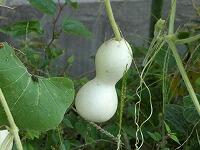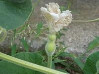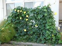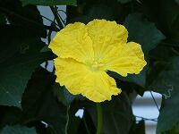 <学校の生き物たち紹介> 保健室前の教材園で、ヘチマが、鮮やかな黄色い雄花を咲かせたり、大きな実を実らせたりしています。