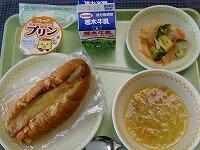 <今日の給食> ピザドッグ・牛乳・こんにゃくサラダ・ジュリエンヌスープ・豆乳プリン