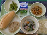 <今日の給食> コッペパン(ツナサンド)・牛乳・ツナサンドの具・タンメン・大平産茶豆枝豆