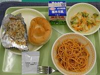 <今日の給食> 【とち介ランチ】米粉パン・岩舟産にっこり梨ジャム・牛乳・なすとトマトのスパゲティ・鶏肉のハーブ焼き・キャベツときゅうりのサラダ