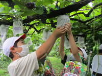 盤峰園では、二人組で協力してぶどう狩りを行ったり、ぶどう園の方の話をよく聞きながらメモをとったりしていました。