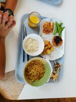 <今日の給食> ご飯(ガパオライス)・牛乳・ガパオライスの具・フォースープ・ぶどうのジュレポンチ