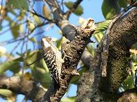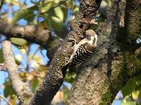 <学校の生き物たち紹介> 朝の校庭巡回中、桜の幹に穴を空けて餌を見つけているコゲラに出会いました。