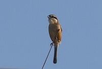 <学校の生き物たち紹介> 9月の半ばごろから、さえずりをよく聞くようになってきているモズ。校庭南西の雑木林から、屋上のアンテナの先に移動していきました。