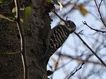 この鳥は、キツツキ目キツツキ科のコゲラです。木を突きながら採餌している様子も観察することができました。(コゲラの左側の黒っぽい小さい丸の部分が、採餌するためドラミングをして開けた穴です。)