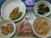 <今日の給食> 苺米粉パン・牛乳・きつねうどん・笹かまの新緑揚げ・もやしとほうれん草の磯香和え