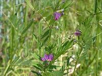 <学校の生き物たち紹介> 校舎北側の畑で、可憐な紫色の花を咲かせているカラスノエンドウ。