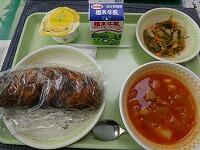 <今日の給食> アップルパン・牛乳・ハンバーグケチャップソースがけ・ゆで野菜サラダ・ワンタンスープ