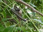 それは、チョウ目、タテハチョウ科の ヒオドシチョウ というチョウの幼虫だったのです。羽を閉じた姿はとても地味ですが、羽を開くと、鮮やかな緋色に黒色の斑があり、黄褐色と青色の縁取りがある、とても美しいチョウです。