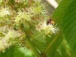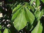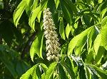 栃木県民にはなじみの木、トチノキ(トチノキ科)です。栃木県の県木でもあり、校庭のものは、あっという間に大きな葉を茂らせ、白い花をたくさん咲かせています。(この仲間には、赤い花を咲かせる種類もあるようです。)