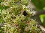 これは、ハチ目ミツバチ科の コマルハナバチ のメスのようです。花の周りを飛び交いながら、一生懸命花粉を集めていました。さらによく見てみると、数多くのコマルハナバチがいることが分かり、それらの羽音が折り重なって、低いうなり音として聞こえてきていたことが分かりました。