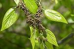 左上のような葉を茂らせ、右上のような実を実らせる樹木に、その生き物が群がっているのを、去る4月23日(木)のお昼過ぎに、6年生男子が発見して、職員室に知らせてくれました。