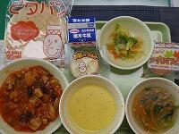 <今日の給食> ピタパン(メキシカンサンド)・牛乳・メキシカンチキン・ゆで野菜・コーンポタージュ・お米のタルト