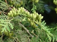 <学校の生き物たち紹介> 校庭西フェンス沿いでは、花粉症で悩まされたヒノキが実を付けています。
