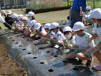 はじめに、サツマイモについてのお話と植え方の説明を聞きしました。その後、子どもたちは、一人一人丁寧にご指導いただきながら、慣れない手つきでしたが、一人1本ずつ苗を植えることができました。