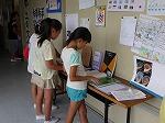 また、各教室前の廊下には、習字や理科研究、作文やポスターなど、子どもたちが夏休みに取り組んだ成果が展示されています。休み時間には、友達が取り組んだ作品を見て学ぶ子どもたちの姿が見られました。