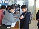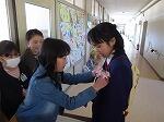 まずは、登校後、昇降口で、5年生に胸花を付けてもらい、飾り付けされた教室へ入りました。