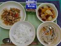 <今日の給食> ご飯・牛乳・にら饅頭・豚肉となすの味噌カレー炒め・春雨スープ