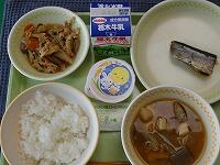 <今日の給食> 十五夜メニュー ご飯(きのこご飯)・牛乳・きのこご飯の具・サンマのかぼすレモン煮・味噌けんちん汁・十五夜ゼリー