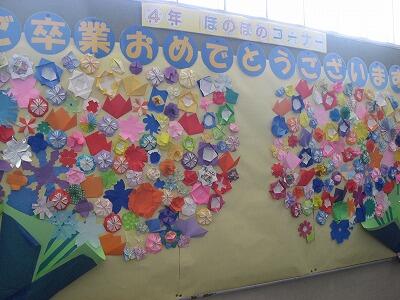 卒業式まであと8日となりました。2年生の菜の花の掲示に続いて、卒業生に向けて各学年で作成した「卒業おめでとう」の掲示物が掲示され始めました。卒業生の皆さん、在校生からのエールが届いてきますね。