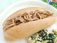 <今日の給食> ミニコッペパン(焼きそばパン)・牛乳・焼きそばパンの具・小松菜とえびの卵炒め・アセロラジュレポンチ