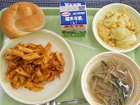 < 今日の給食 >【大平中央小思い出献立】米粉パン・牛乳・ペンネのポロネーゼ・こんにゃくサラダ・コンソメスープ