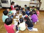 1年生が輪を作って、カルタ取りをして楽しんでいるのですが、よく見ると、輪の中に、少し大きめのお兄さん、お姉さんが入っていました。読み札を読む役割をしていました。