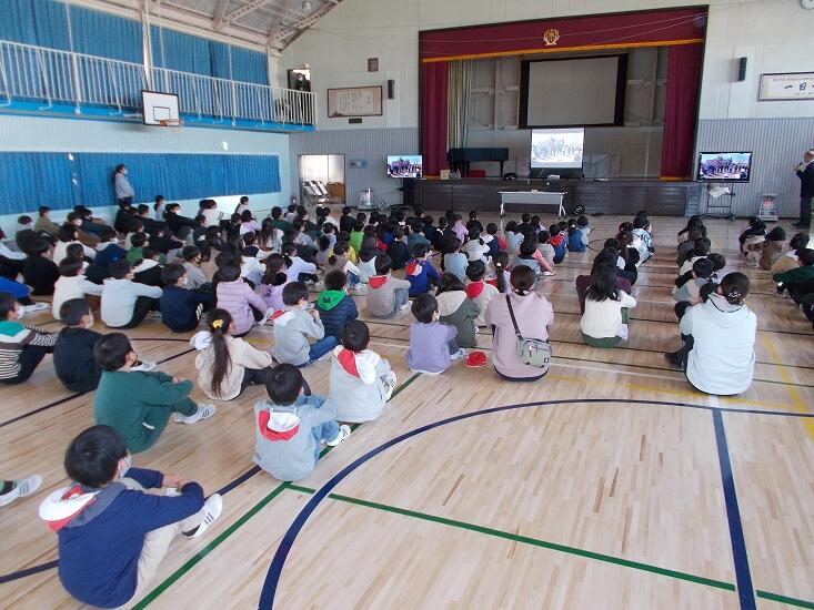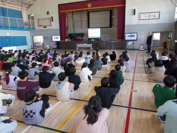 2月21日、体育館で朝会を行いました。改修工事により体育館での集会が行えなかったため、全校生が集まったのは、約7か月ぶりとなります。この日は、表彰と校長先生のお話でした。表彰では書道と英語検定の表彰をしました。その後、校長先生から「東小ルック」についての話がありました。学校は勉強するところです。学習(学校生活)にあった「ルック(身だしなみやマナーなど)」について、スライドを使って説明しました。子どもたちは、いろいろと考えながら話を聞いていました。聞く姿勢もよかったです。私たち大人も、気を配りたいですね。