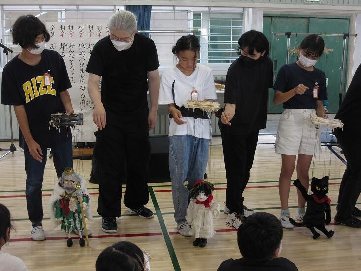 6月29日、6年生は人形浄瑠璃の体験授業に参加しました。「糸あやつり人形一糸座」のみなさんを講師に、午前中は糸操り人形の操作体験、午後は本公演を鑑賞しました。糸あやつり人形の操作体験では、一座の方々に教わりながら「歩く」という基本動作を体験しました。はじめ動きもたどたどしかったのですが、次第に慣れてくると人形の動きも「らしく」なってきました。午後の公演では、代表児童4名が村人役として登場しました。人形をあやつりながら、覚えたせりふを上手に言うことができました。貴重な体験授業となりました。「糸あやつり人形一糸座」のみなさん、いろいろとお世話になり、ありがとうございました。フォトアルバムに写真があります。ご覧ください。