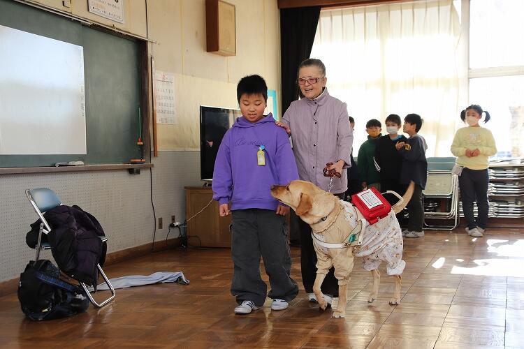 12月13日、4年生は盲導犬ユーザーさんとの交流学習を行いました。はじめは、ユーザーさんに盲導犬と出会うまでのことをお話しいただきました。盲導犬と出会ったことで、行動範囲が広まったことはもちろん、それにかかわる多くの人たちともつながりができたと、話してくださいました。子どもたちはユーザーさんのお話を静かに聞いていました。後半には、ユーザーさんを手引きで誘導する体験もしました。肘や肩に手をかけてもらい、周りの状況などを教えながら歩きました。最後に、特別に盲導犬とふれあいもさせてもらいました。短い時間でしたが、子どもたちにとって貴重な体験ができました。