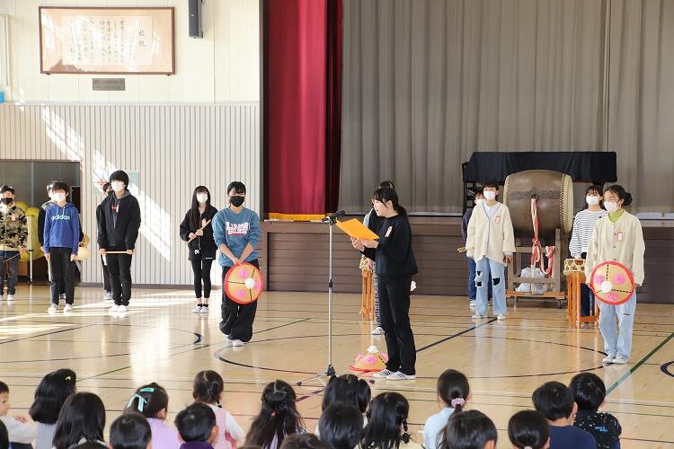 2月20日、おはやし引継ぎ式を実施しました。今回は4年生も引継ぎのメンバーに加わり、1月からおはやしの練習をしてきました。今日は6年生が最後のおはやし演奏や歌・踊りを披露し、その後4・5年生に引継ぎました。6年生や5年生の代表児童の話では、「東小の伝統として守っていきたい。」とそれぞれ発表していました。6年生の最後の演奏や歌・踊りはとても上手でした。4・5年生も練習を積んできっと上手な演奏、歌や踊りを披露してくれることでしょう。