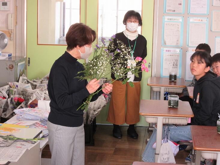 11月28日、6年生は地域コーディネーターさんに紹介していただいた講師をお招きし、生け花体験をしました。はじめに先生から生け花についてや飾り方の基本についてお話を聞きました。その後は早速自分で準備した容器に、花をかざっていきました。先生にお話を伺うと、「子どもたちは、自分の思いを生け花によく表現していましたよ。」とお褒めの言葉もいただきました。授業で飾った生け花は、自宅に持ち帰りました。お家の方は、どんな感想をもったでしょうか。