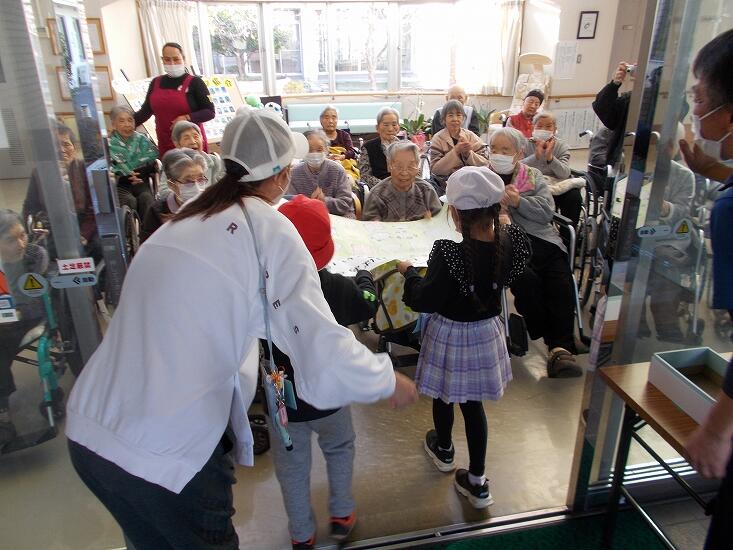 12月13日、1年生は隣接する老人福祉施設、「幸寿苑」を訪問してきました。幸寿苑のみなさんに、ダンスや歌の斉唱を見ていただいたり、お手紙や農園で育てたさつまいもをプレゼントしたりしてきました。ガラス越しでしたが、集まっていただいたみなさんは、楽しそうに1年生の発表を見ていました。時には一緒に歌ってみたり、手拍子したりしていました。1年生から、「これからも長生きしてください。」と呼びかけられると、みなさんとてもうれしそうでした。おじいさんやおばあさんたちがうれしそうだったので、訪問した1年生も大満足だったたようです。これからもできる交流活動を続けていきます。