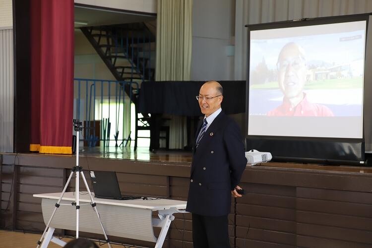 12月14日、朝会を実施しました。この日の朝会は、校長先生のバンコク日本人学校勤務時代の先輩である、「サンチャゴ日本人学校」の校長先生にお話をしていただきました。チリのサンチャゴとZoomでつなぎ、現地からチリやサンチャゴ日本人学校について、お話しいただきました。子どもたちは興味津々、チリのお話を聞いていました。「チリの形は、日本よりももっと細長いんだよ。」「日本から飛行機で30時間くらいかかるんだよ。」などと教えていただくたびに、「えー!」「そーなんだ。」などと、歓声を上げていました。20分があっという間に過ぎました。サンチャゴ日本人学校のホームページ(https://www.iejapones.cl/)もあるそうです。ぜひチェックしたいですね。現地は深夜にもかかわらず快くお話を引き受けてくださいました。ありがとうございました。
