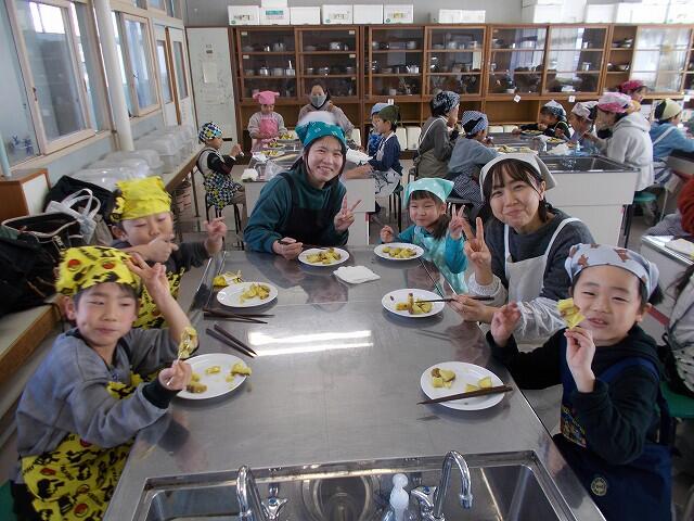 12月18日(月)に、保護者の皆様にお手伝いいただいて、サツマイモ調理を行いました。フォトアルバムに写真があります。ご覧ください。