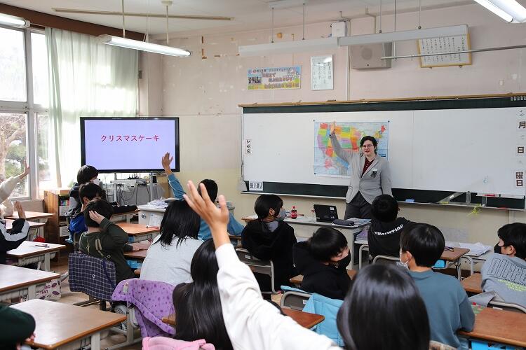 12月20日、6年生は国際交流員さんを迎えての出前授業を実施しました。県から派遣されたアメリカ出身の交流員さんに、アメリカの生活様式や学校生活、観光名所などを教えていただきました。交流員さんのご出身はカリフォルニアだそうですが、今の時期はクリスマスの飾りが個人宅ごとに行われていて、華やかだそうです。子どもたちも興味津々でした。フォトアルバムに写真があります。ご覧ください。