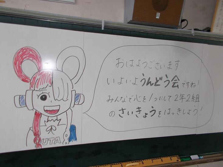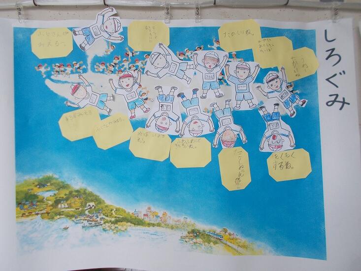 1年生の廊下側にかわいらしい掲示物がありました。「くじらぐもにのった1年生は、何を話しているのか想像しよう。」というめあてで、国語の学習で作成したそうです。子どもたちは、それぞれ楽しそうなお話を書いていました。運動会にぴったりの掲示物ですね。
