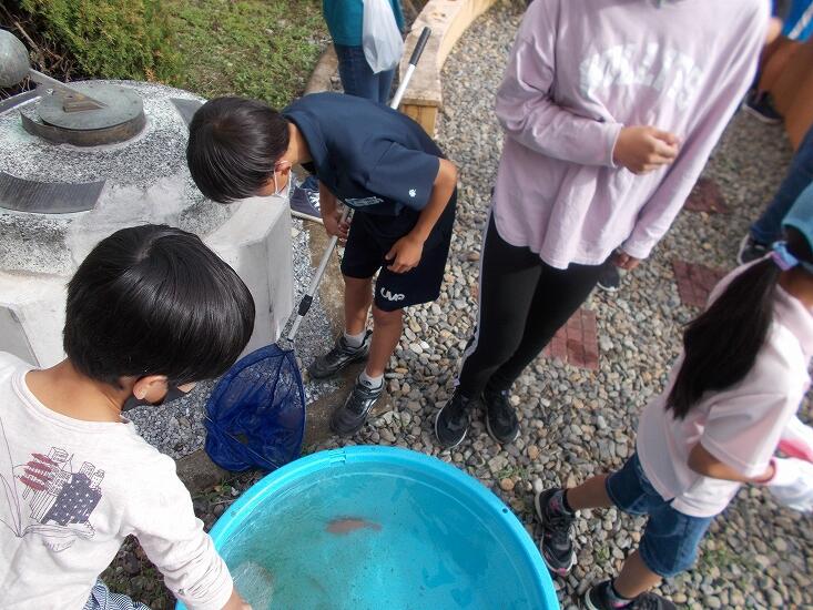 10月15日の午後、中庭の池掃除ボランティアを実施しました。お手伝いに来ていただいたのは、4年生児童とその保護者、おやじの会のメンバー等のみなさんでした。まずは池の魚に気を付けながら、水中ポンプで汚れた水を排水していきました。水が少なくなったところで、事前に準備しておいたおけ等に移していきました。宝探しのようで、参加した子どもたちは楽しそうでした。魚がいなくなったところで、底に沈んでいる泥や石を運び出しながら、壁や底を掃除していきました。おかげでみちがえるほど池がきれいになりました。魚のゆうゆうと泳ぐ姿も見ることができ、「きれいになった!」と達成感をみんなで共有しました。お忙しいところ参加していただいた保護者・おやじの会のみなさん、そして子どもたち、ありがとうございました。魚たちも感謝していることでしょう。
